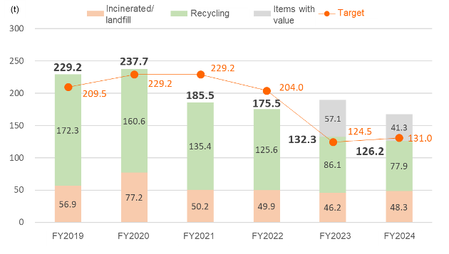 At our Sagamihara Plant, we conduct activities based on targets that we set for the reduction of waste to be generated every year, as part of our environmental management system. We are working on reducing waste by sorting refuse generated in business activities, excluding items with value such as scrap iron generated in pressing processes, into refuse to be incinerated and put into a landfill and recyclable refuse. Since fiscal year 2023, we have been working to further reduce recycling waste by further sorting items with value that contain recyclable resources as items with value.