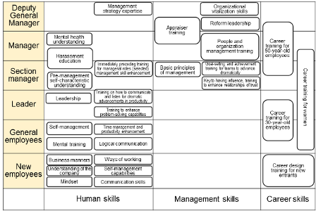 In particular, we emphasize “an organization that uses diversity and the improvement of people management abilities,” and we provide “opportunities for human resources that will lead organizations to correctly recognize the differences in values and thinking styles in a diverse group of human resources, and refine their human skills centered on communication ability.”